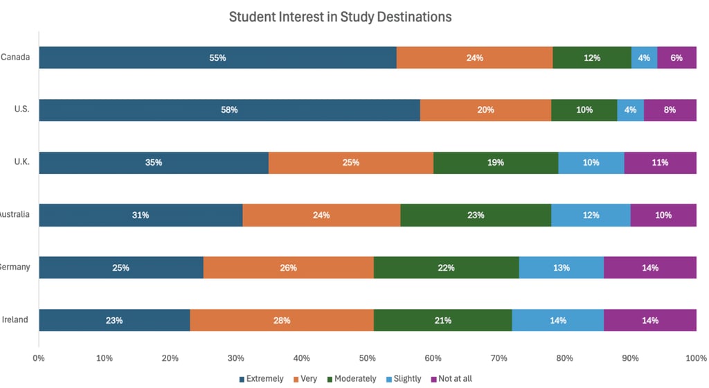 Canada also stood out with the lowest share of students indicating no interest in studying there (6%), whereas other countries saw higher levels of disinterest.